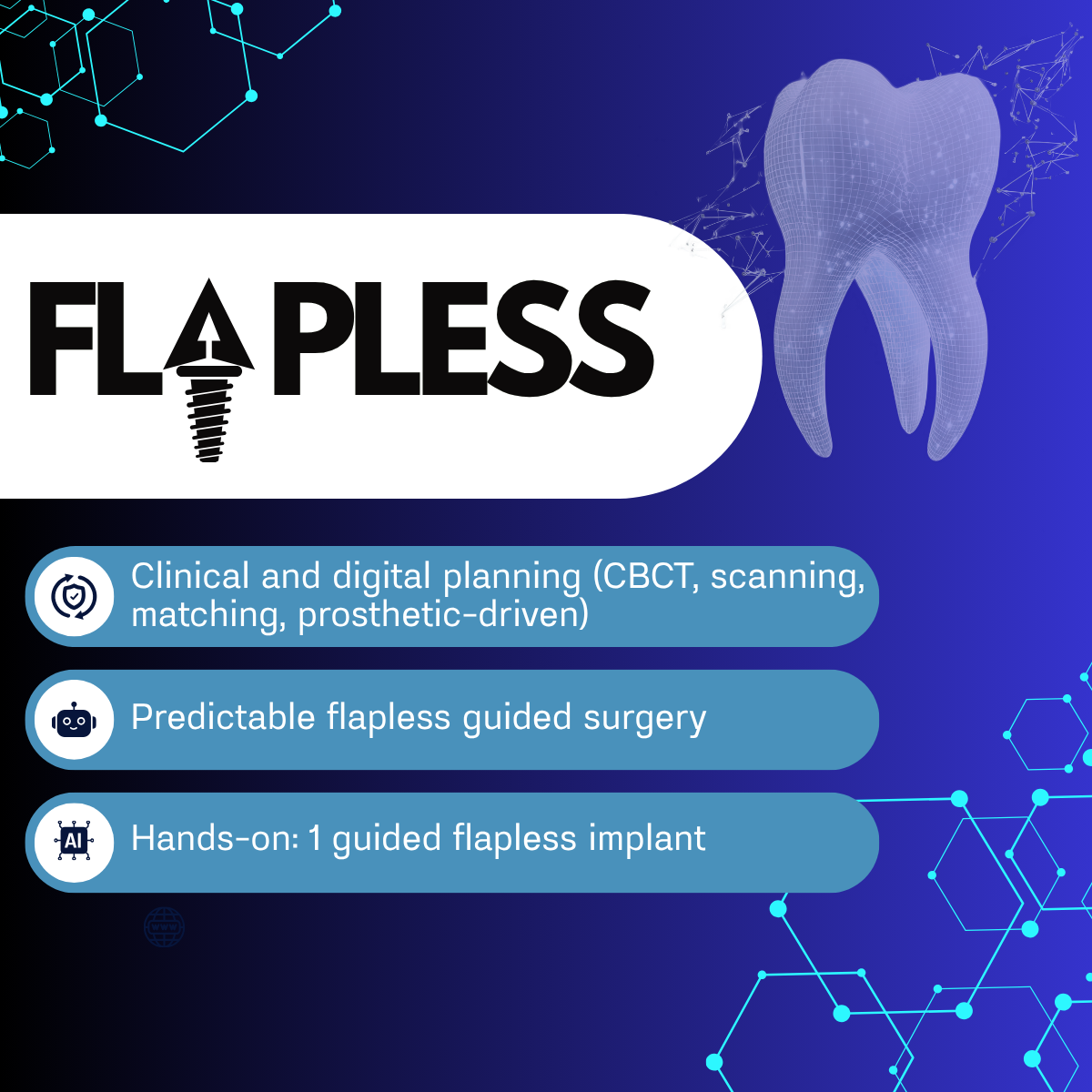 FLAPLESS is a comprehensive educational program designed as an integrated system: imaging, intraoral scanning, DICOM–STL matching, prosthetically driven planning, surgical guides (from simple to complex), 3D printing, guided surgery kits, flapless execution, and decision-making for regenerative cases (Khoury grafting, sinus lift, apical resection + bonus endodontics).